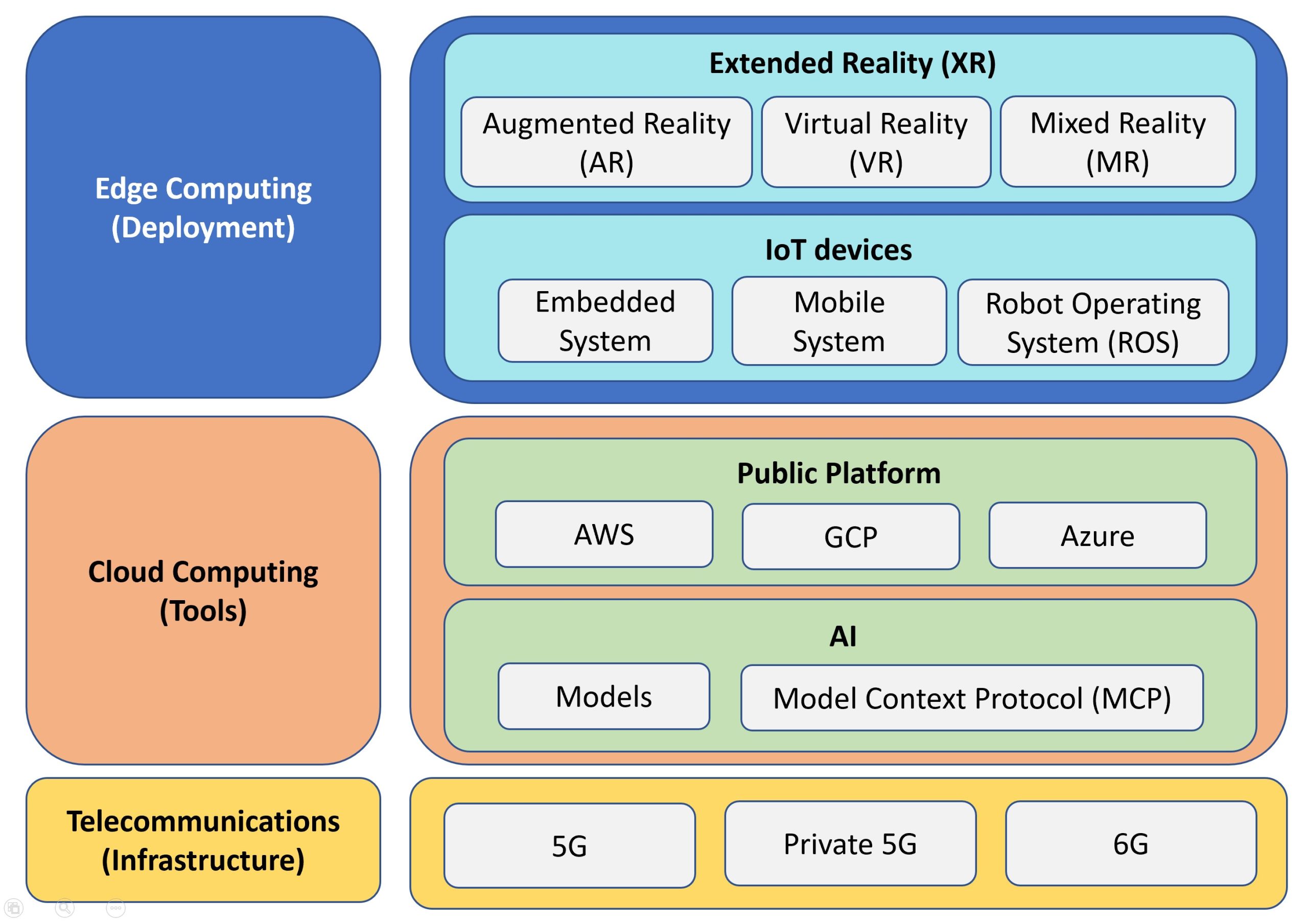 We focus on several innovative areas, including Edge Computing (deployment), Cloud Computing (Tools), and Telecommunications (Infrastructure).